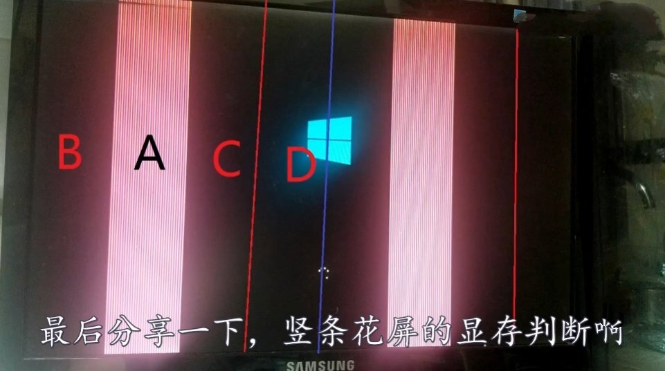 A卡老卡常见花屏如下图,位置判断也基本很好判断,从左到右分别为显存颗粒B、A、C、D区域 当然,这种规律目前仅限470,480,570,580等显卡。 原作者为星宇大叔给出的视频截图。