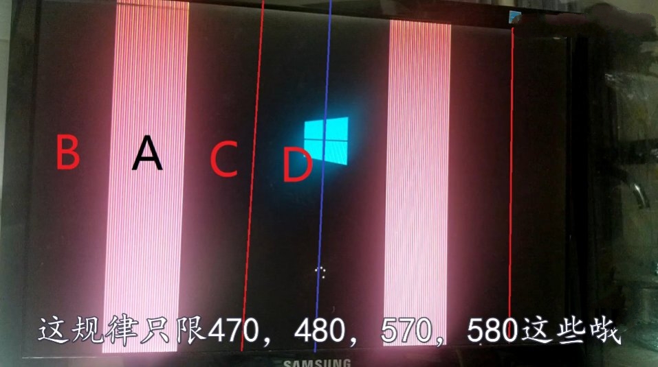 A卡老卡常见花屏如下图,位置判断也基本很好判断,从左到右分别为显存颗粒B、A、C、D区域