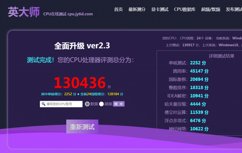 在cpu.jy6d.com英大师的网页版测试中,我们可以看到,上次测试分数为130917分,限制181W功耗后再次测试分数依然有130436分,可以说几乎没有什么性能损失。