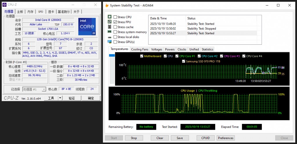 在FPU烤机测试中,全核睿频4.5G,温度为85度左右。电压1.154V